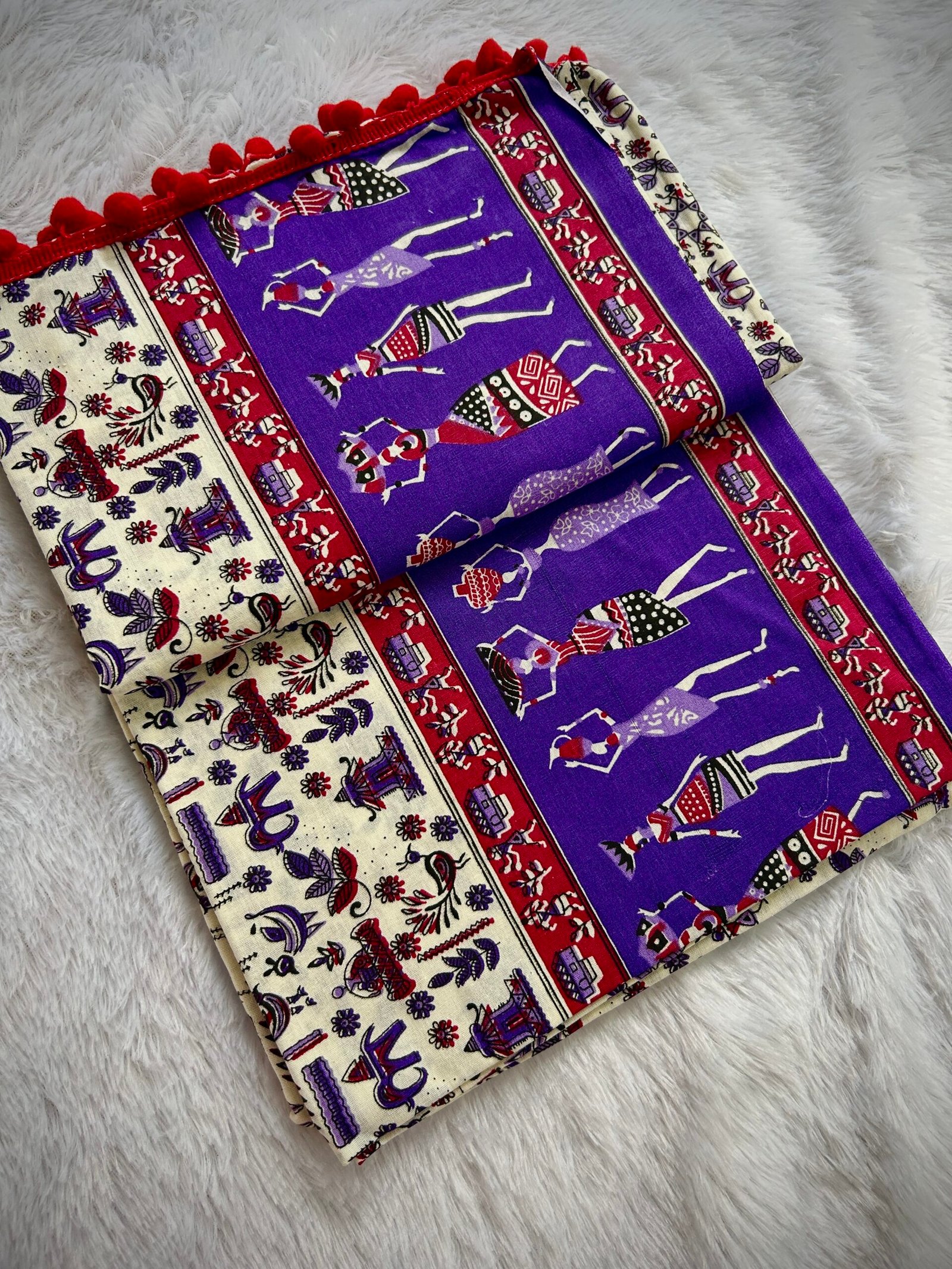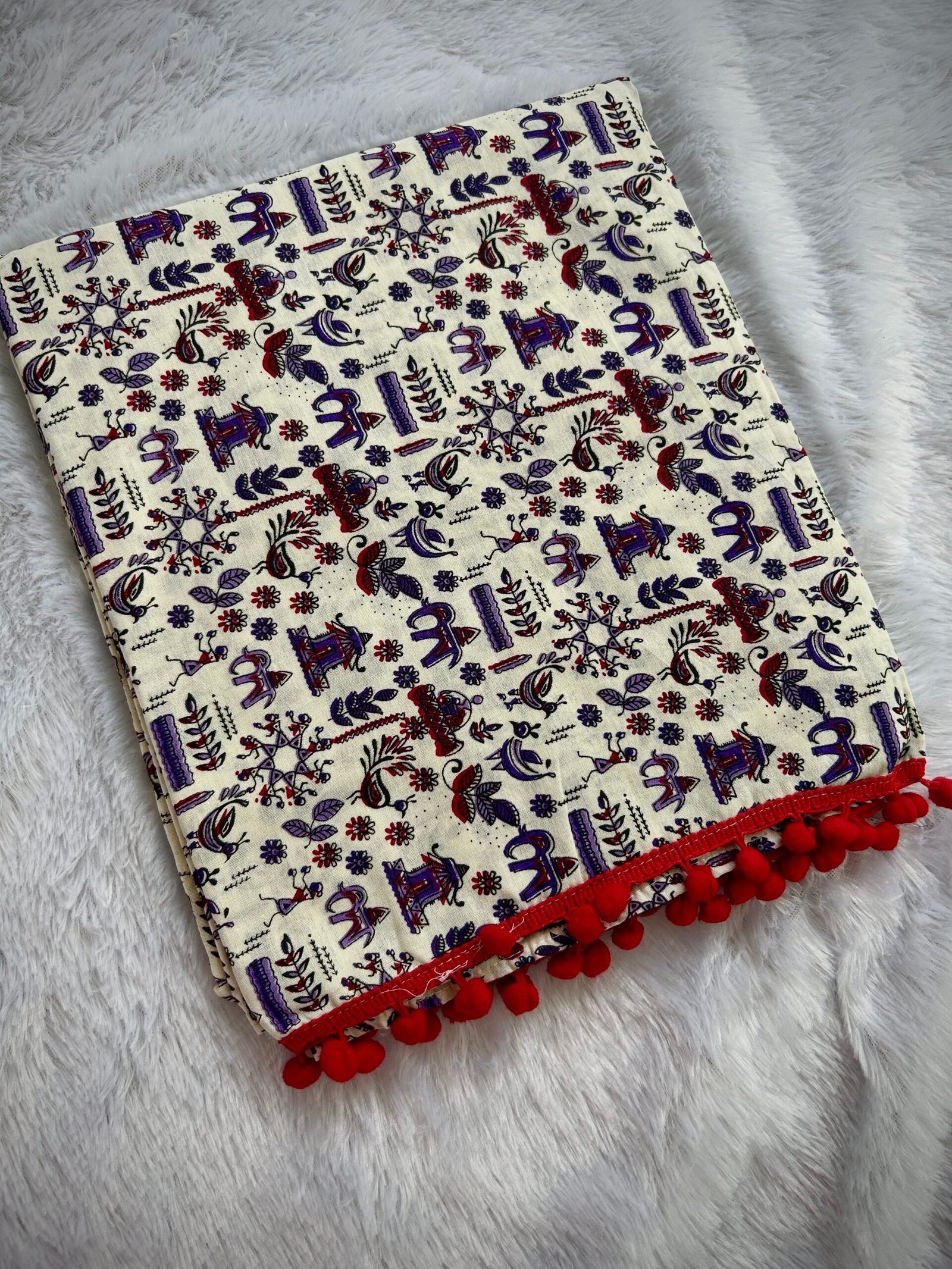 Cotton Kalamkari Folk Print Saree With Red Tassels