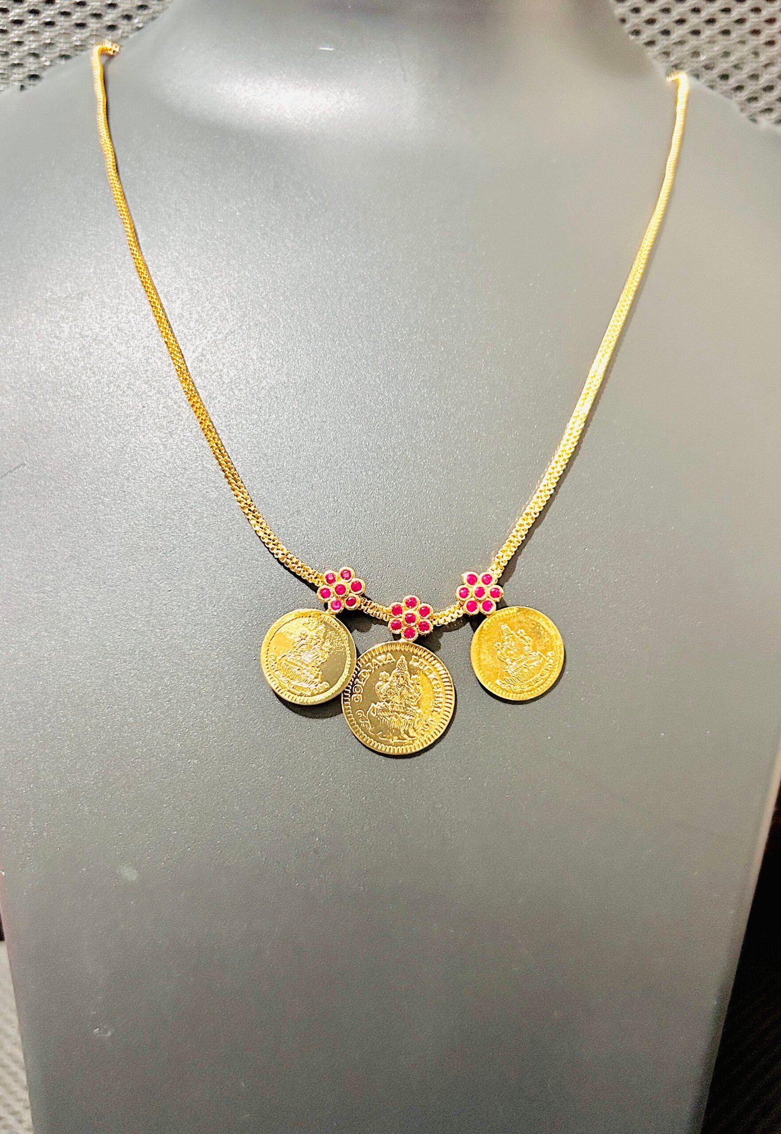 Gold Plated Three Lekshmi Coin Necklace with Ruby Stones